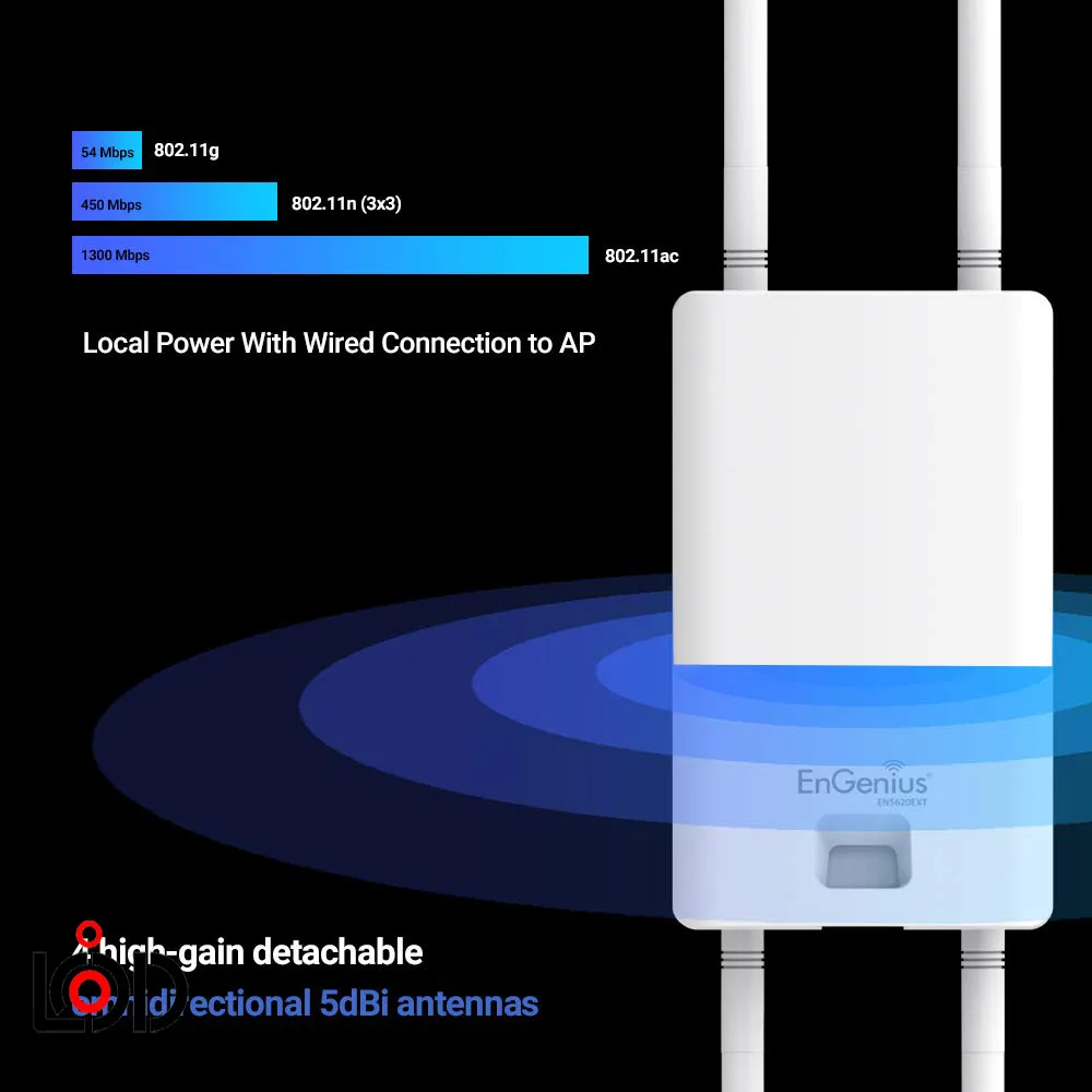 اکسس پوینت EnGenius ENS620EXT با امکانات وسیع و استفاده از استاندارد 11ac wave 2 به راحتی محیطهای خارجی (Outdoor) در شبکه با تراکم کاربری بالا را پشتیبانی میکند. با بهره گیری از آنتنهای MIMO 2×۲ با تکنولوژی Beamforming (تکنولوژی ویژهای برای متمرکز کردن سیگنالها) این اکسس پوینت بهره وری وایرلس را در محیطهای بزرگ مسکونی و تجاری مانند زمینهای بزرگ و فروشگاههای زنجیرهای به حداکثر میرساند.
